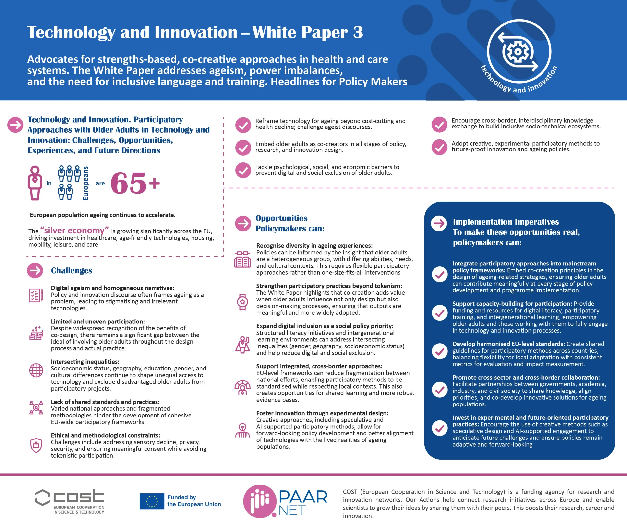 Gender equality is a cross-cutting priority of PAAR NET. Across the project, we embedded gender-sensitive approaches in research, participation, data analysis, and outcomes. Looking with a gender lens on each White Paper, we surfaced concrete evidence of how gender shapes participation, access, and equity. Together, these findings show that meaningful change requires recognising gender not as a side issue but as a structural factor influencing every dimension of ageing and participation.